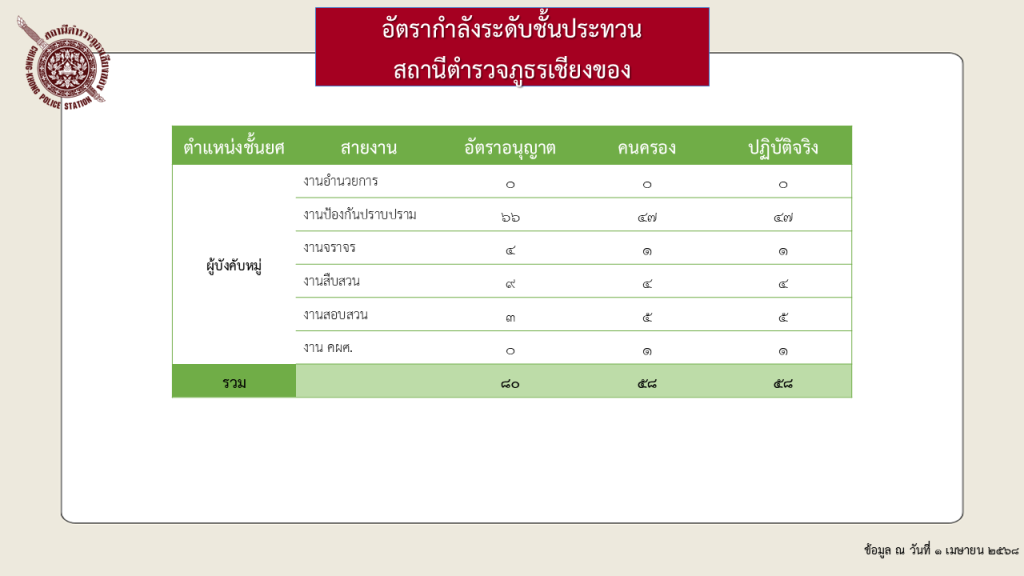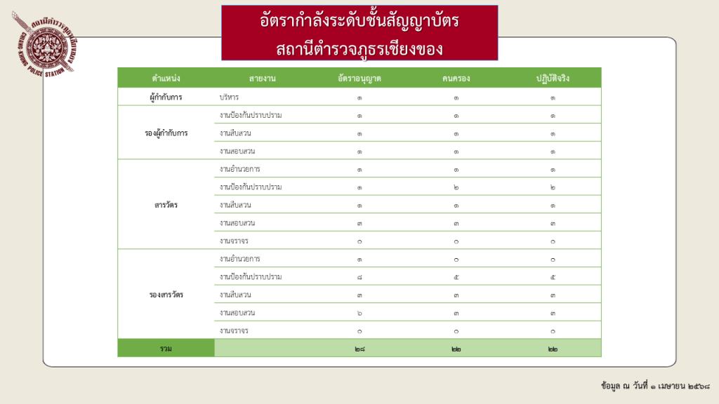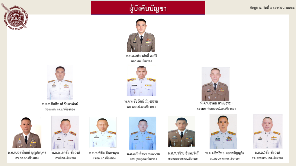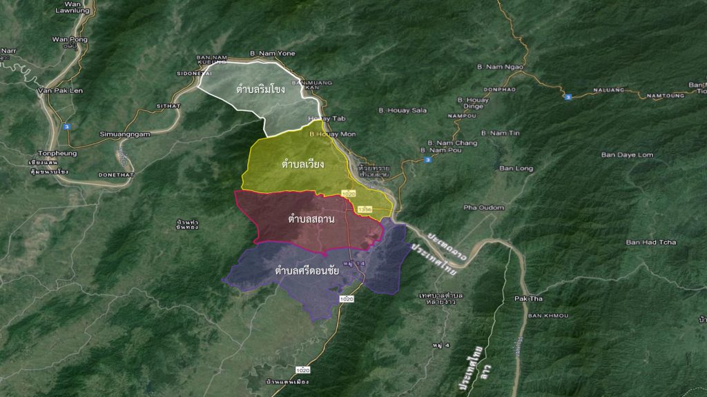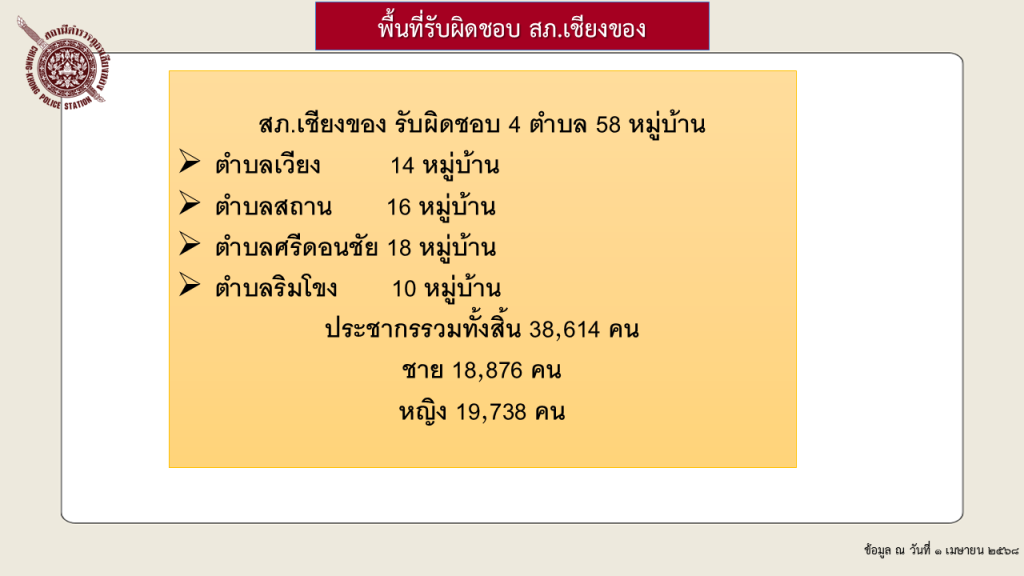 หมู่บ้านพื้นที่ส่วนที่อยู่ในความรับผิดชอบของ สถานีตำรวจภูธรเชียงของ จำนวน 4 ตำบล 58 หมู่บ้าน ประกอบด้วย ตำบลเวียง มี 14 หมู่บ้าน พื้นที่จำนวน 122.55 ตารางกิโลเมตร ตำบลสถาน มี 16 หมู่บ้าน พื้นที่จำนวน 101.00 ตารางกิโลเมตร ตำบลศรีดอนชัย มี 18 หมู่บ้าน พื้นที่จำนวน 93.10 ตารางกิโลเมตร ตำบลริมโขง มี 10 หมู่บ้าน พื้นที่จำนวน 86.40 ตารางกิโลเมตร