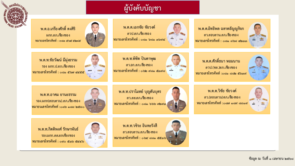 สถานีตำรวจภูธรเชียงของ เป็นอำเภอชายแดนตั้งอยู่ด้านทิศตะวันออกเฉียงเหนือ ของจังหวัดเชียงราย ติดกับสาธารณรัฐประชาธิปไตยประชาชนลาว(สปป.ลาว) มีลำน้ำโขงเป็นเส้นกั้นเขตแดน ห่างจากกรุงเทพมหานคร ๙๕๐ กิโลเมตร มีอาณาเขตติดต่อกับเขตการปกครองข้างเคียงดังต่อไปนี้ ทิศเหนือ – ติดกับตำบลแม่เงิน จังหวัดเชียงราย และเมืองห้วยทราย แขวงบ่อแก้ว สปป.ลาว โดยมีลำน้ำโขงเป็นแนวกั้นพรมแดน ทิศใต้ – ติดกับตำบลยางฮอม อำเภอขุนตาล และตำบลแม่ต๋ำ อำเภอพญาเม็งราย จังหวัดเชียงราย ทิศตะวันออก – ติดกับอำเภอเวียงแก่น จังหวัดเชียงราย และเมืองห้วยทราย แขวงบ่อแก้ สปป.ลาว โดยมีลำน้ำโขงเป็นแนวกั้นพรมแดน ทิศตะวันตก – ติดกับตำบลบ้านแซว อำเภอเชียงแสน ตำบลปงน้อย อำเภอดอยหลวง และตำบล แม่ต๋ำ อำเภอพญาเม็งราย จังหวัดเชียงราย